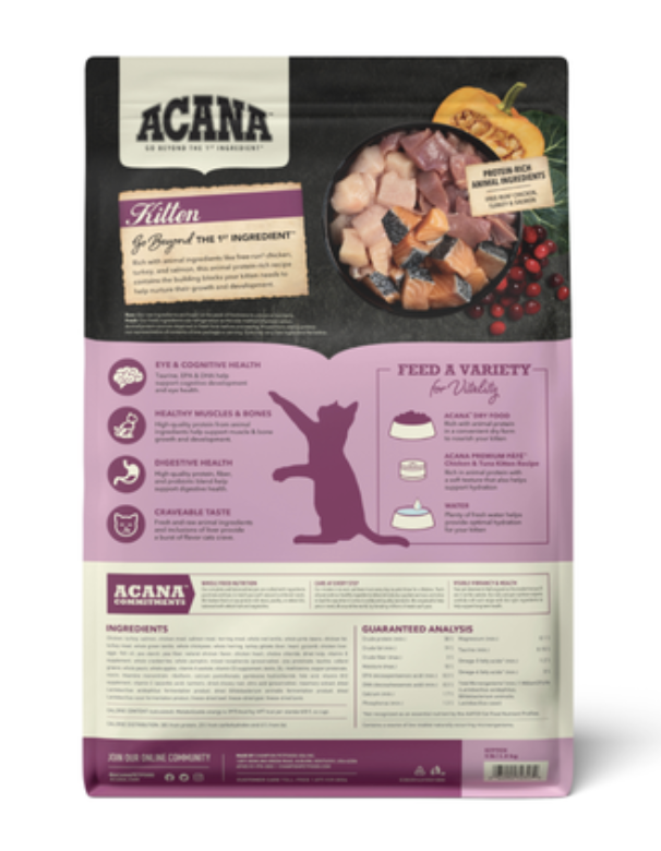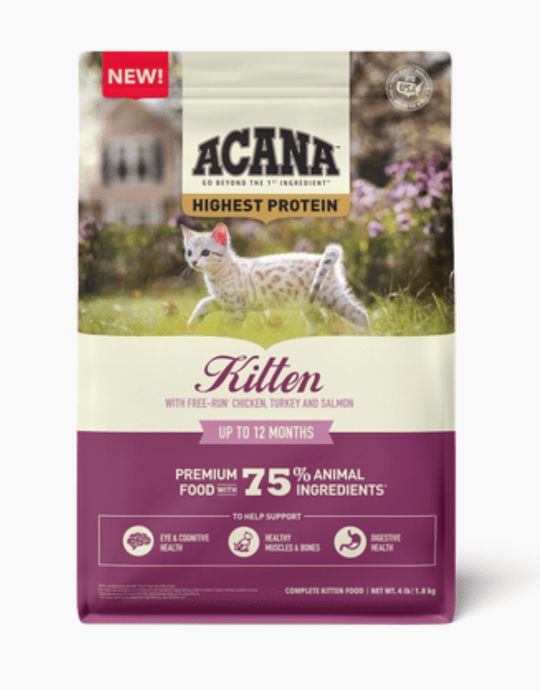 Nurture your growing kitten with more animal protein in ACANA™ Highest Protein Kitten recipe. Perfect for kittens up to 12 months old, this premium recipe is rich with 75% animal ingredients* including free-run** chicken, turkey, and salmon to satisfy and nourish your young feline. Our nutritious ingredients also help support the healthy development of your kitten, including healthy heart & eyes and digestive health. See your kitten grow up healthy and strong with protein-rich recipe crafted specially for their needs.