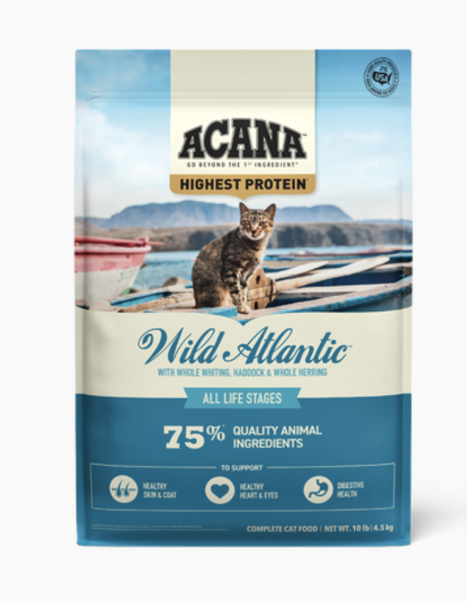 Rich with the highest level of animal protein*, the ACANA™ Highest Protein Wild Atlantic Recipe will satisfy your cat completely with its rich fish ingredients and flavor. Crafted with 75% animal ingredients** including wild-caught whole mackerel, herring and hake, this recipe provides your cat with a variety of nourishing animal protein. This nutrient-dense recipe also helps support key health benefits including your cat’s digestive health, healthy skin & coat, and healthy heart & eyes. Nurture your feline completely with the rich animal protein and nutrition in ACANA Highest Protein Wild Atlantic Recipe!