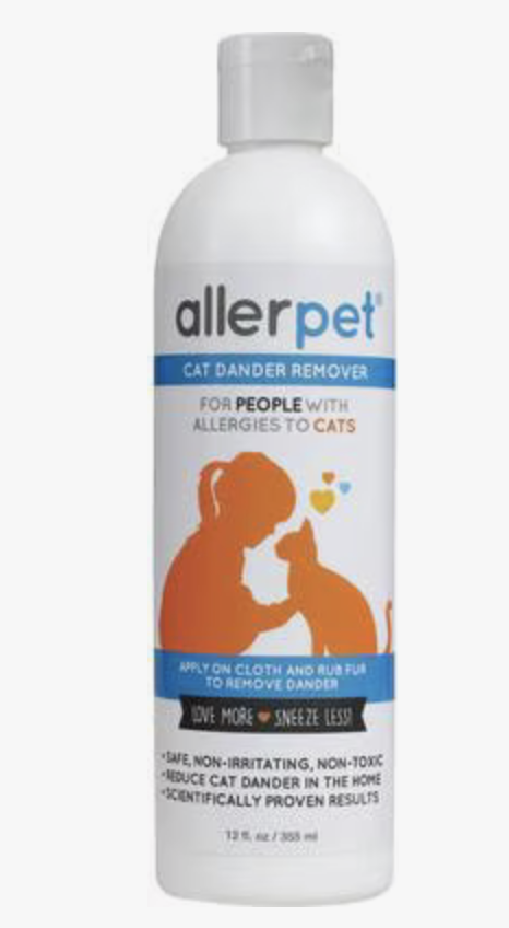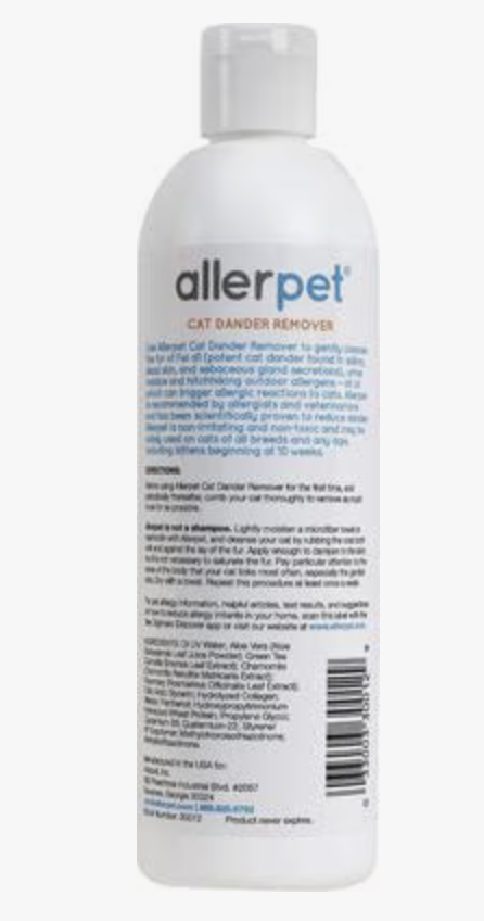 Love more and sneeze less with the Allerpet Cat Dander Remover. Created specifically for homes with cats, who produce more dander than any other animal, this treatment works hard to bind and remove cat allergens. The scientifically-proven formula works by simply removing the dander before it becomes airborne, while cleansing and conditioning the skin and fur. Easily applied by dampening a towel with Allerpet and thoroughly wiping the animal. Scientifically proven to reduce dander loads by 50% with a weekly application, or every three to four days for best results. Now dander allergic cat owners can live more comfortably with their cats.