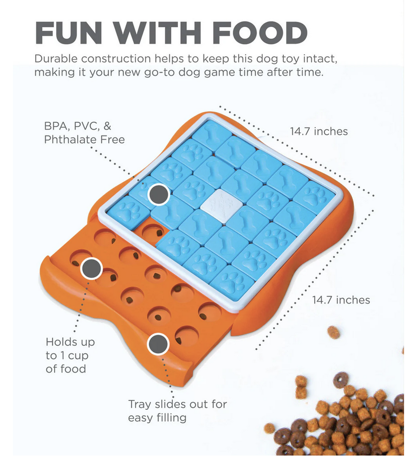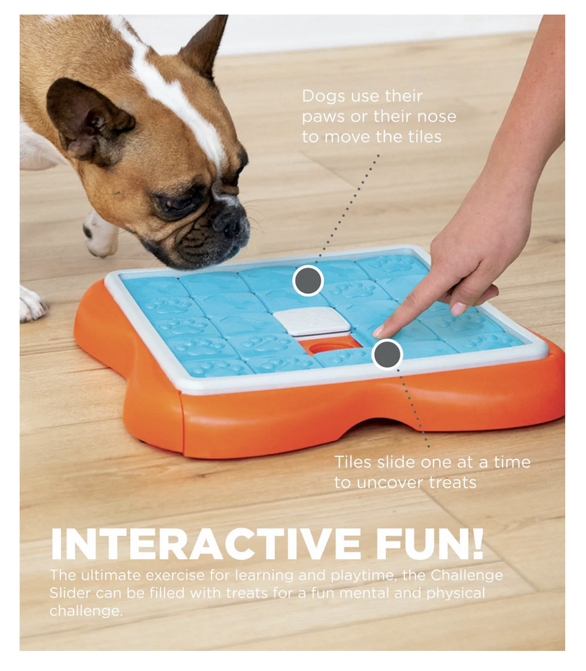 The Nina Ottosson by Outward Hound Challenge Slider is a fun way to challenge your dog’s mind! This Level 3 Advanced dog puzzle is great for dogs who have mastered Level 2 dog puzzles. It keeps dogs busy with mentally stimulating treat challenges that activate your dog’s senses and tap into their natural instincts to hunt and forage for food. As a result, our dog enrichment toys provide mental and physical exercise, help relieve stress, and reduce boredom for happier, healthier pups. Great for small, medium, and large dogs, the Challenge Slider requires dogs to complete a series of actions in order; this encourages dogs to tap into their mental skills and problem-solve right before your eyes! Watch your dog use their brain to sniff out the treats, then slide the tiles one at a time to reveal the hidden rewards! Since all dogs are unique, you can vary the level of difficulty of this dog food puzzle to meet your dog’s problem-solving ability, with multiple ways to make it easier or harder for your pet. Moreover, this dog treat puzzle is easy to clean and made from food safe materials that are BPA, PVC, lead, and phthalate-free for your convenience and peace of mind.