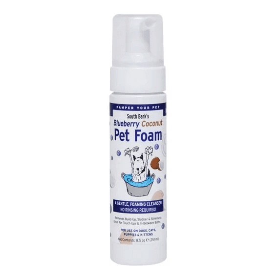South Bark Blueberry Coconut Pet Foam is a gentle, foaming cleanser – no rinsing required.